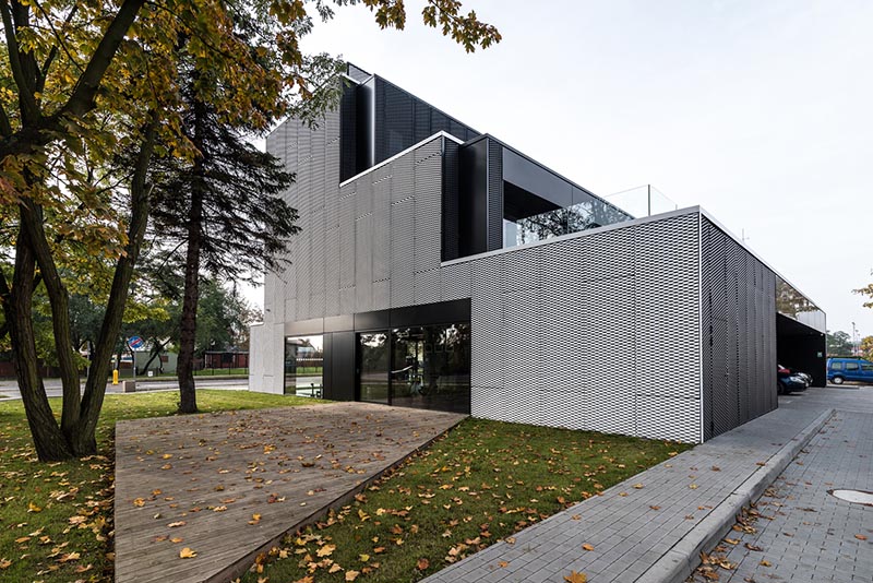 Wiadomości Wrzesińskie (Wrzesińskie News) 的三层编辑办公建筑的形式是由其功能和低预算决定的。梯级台地的轮廓满足了出版社各种活动的需要。同时向上逐渐减少的楼层面积和功能组团的优化减少了资金的投入。